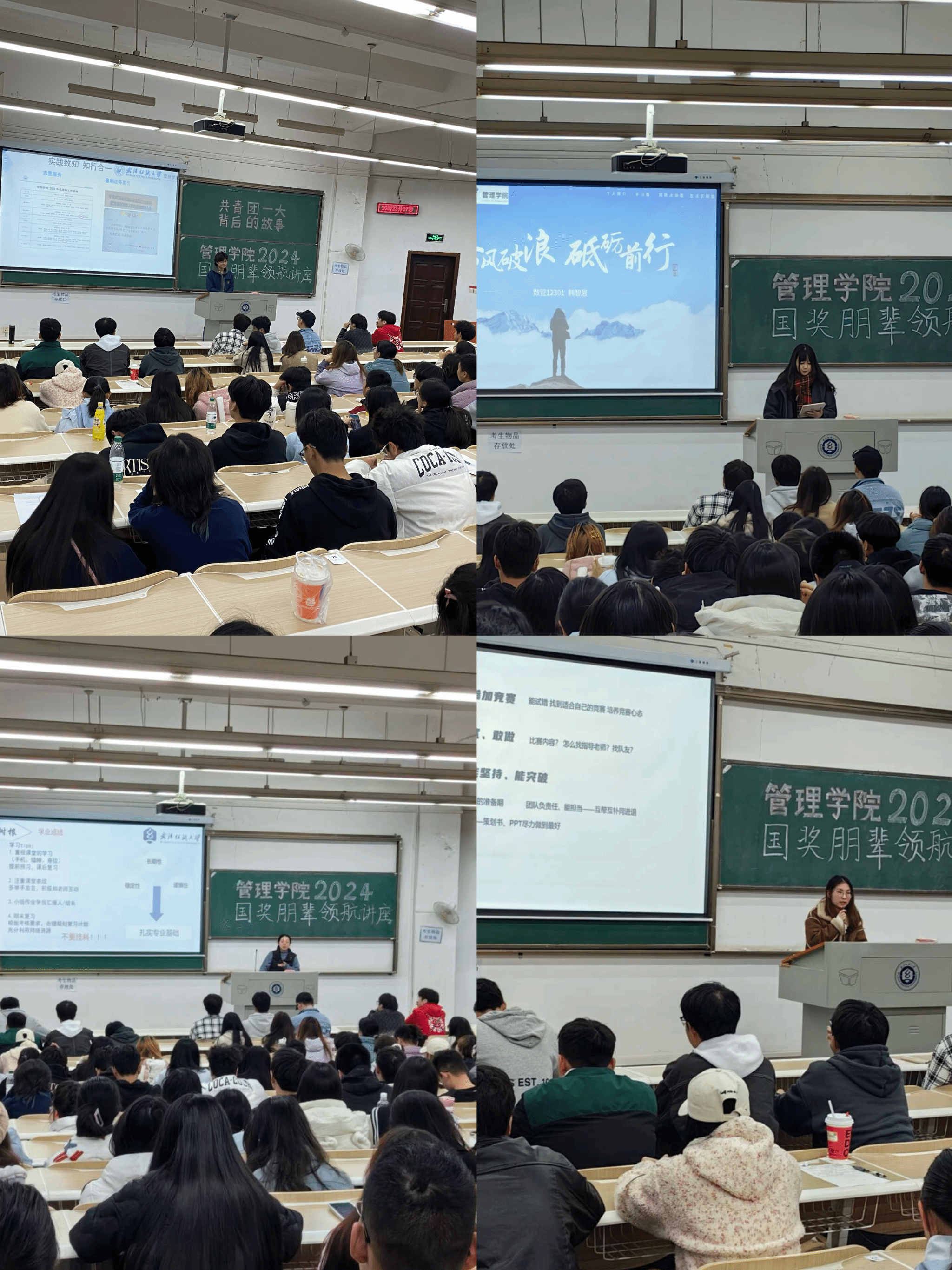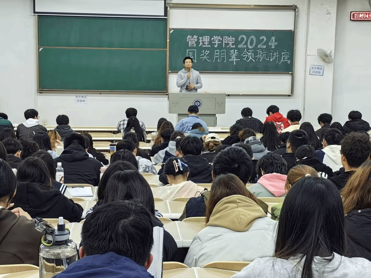 12月8日,威廉希尔体育于崇志楼T101教室开展主题为“头雁领航,见贤思齐”的国家奖学金朋辈领航分享会,旨在通过优秀学生的经验和心得,激励管院学子追求卓越,实现自我提升。会议由2024级辅导员许清纯主持,2024级全体新生参与了分享会。本次分享会邀请了学院2024年四位国家奖学金获得者从不同维度分享了他们的心得体会,为在场学生提供了宝贵的学习机会。