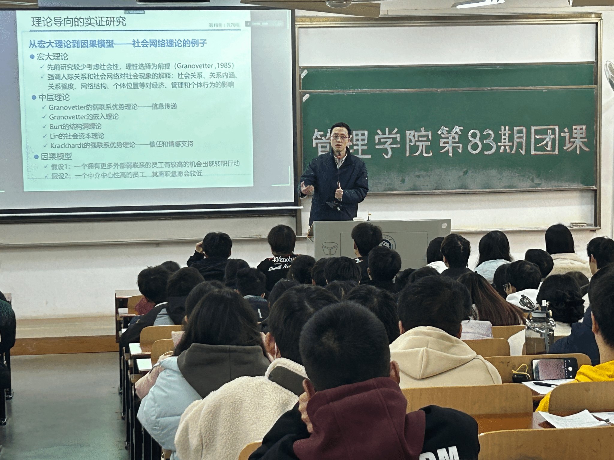 张星教授为同学们带来团课《管理理论导向的实证研究——论文实例》。他通过科研与“盲人摸象”、问题的转化、从宏大理论到因果模型、模型的建立与检验详细阐述了管理理论导向的实证研究,结合“医疗众筹中的信息机制:众筹信息的内容、表达及扩散研究”“当前的研究——在线健康社区医生面部吸引力对患者选择的影响”等多个论文主题进行实证分析。他鼓励同学们在科研上做一个喜欢“摸象”的笨孩,保持想象力和探索力,找到自己的大象,讲述有趣的故事。