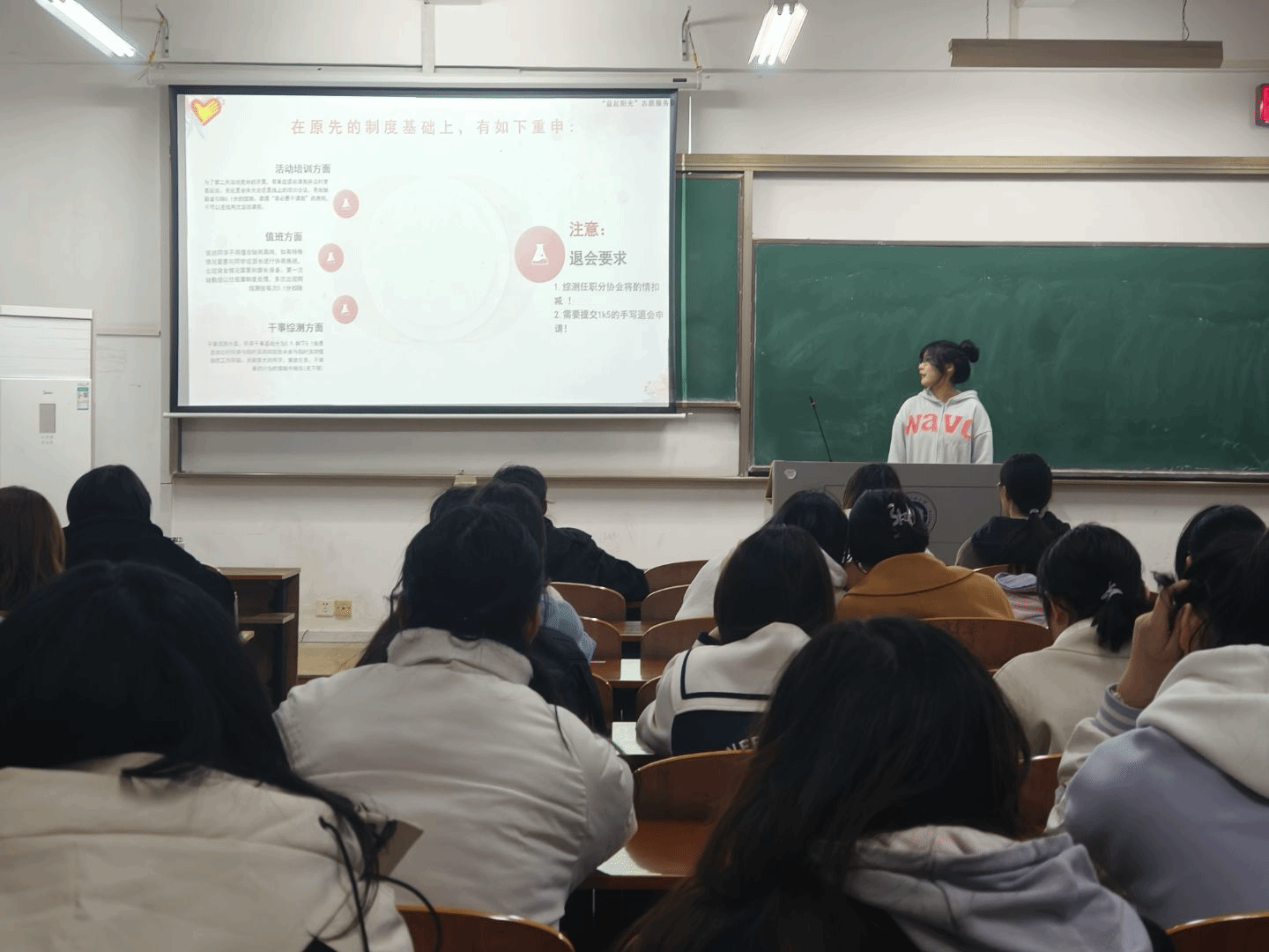会议伊始,主持人丁诗琦结合近期工作开展情况,在服务队原有制度的基础上着重强调了活动培训、值班安排、干事综测等方面的注意事项。