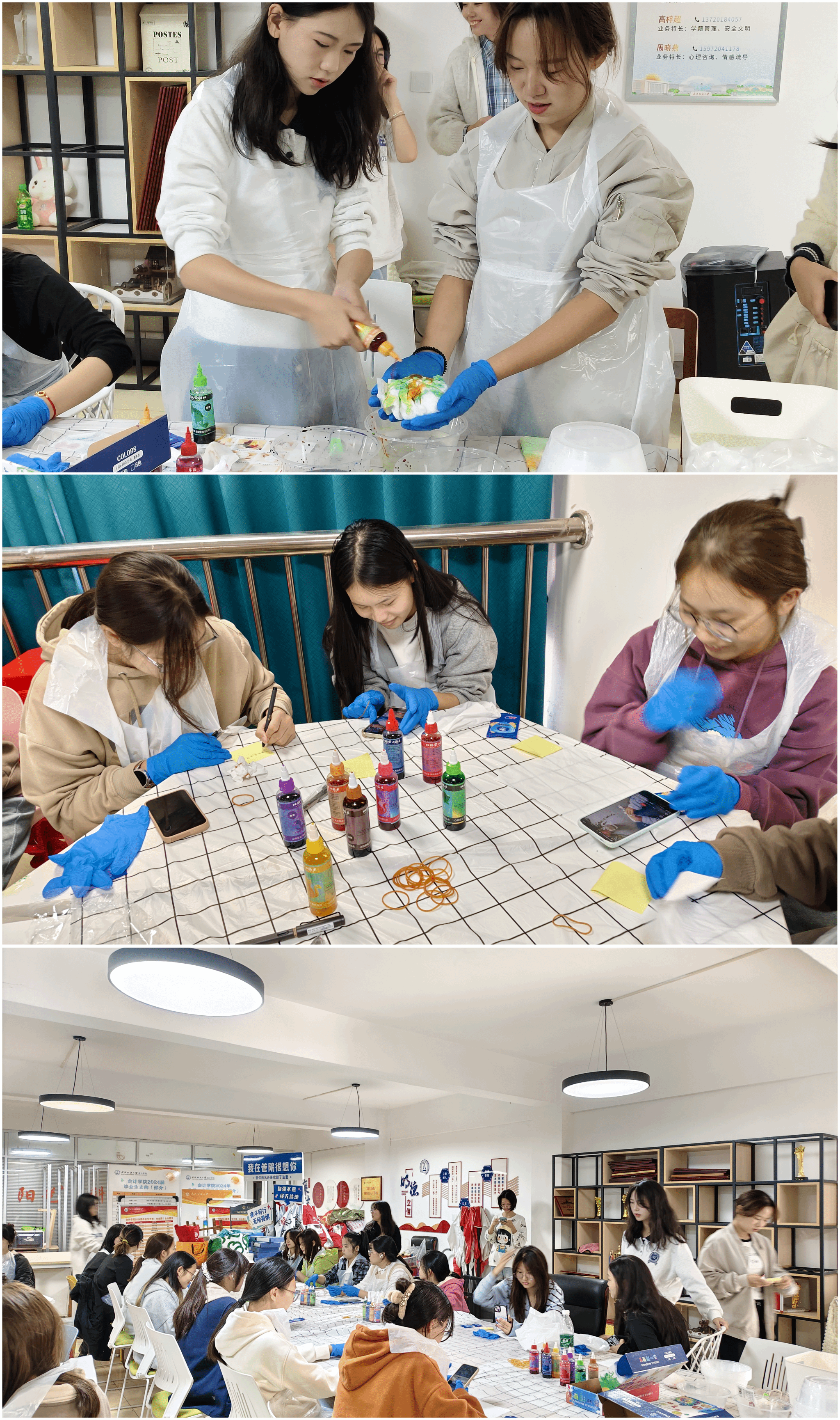 活动现场气氛热烈。活动伊始,负责人介绍了主题内容与流程安排,并重点强调了染料使用安全规范。在扎染体验环节,同学们充分发挥创意,自由组合设计、捆扎布料,亲手制作出各具特色的扎染作品。活动过程中,工作人员耐心指导、协助解答操作疑问,确保参与同学顺利体验手工创作乐趣。除动手实践外,活动还设置了“心灵信箱”环节。参与者匿名书写情绪小纸条并投入信箱,以轻松方式表达内心感受。在作品展示阶段,同学们积极分享创作思路与参与心情,交流在“创作—等待—揭晓”过程中获得的成长体验与情绪变化。