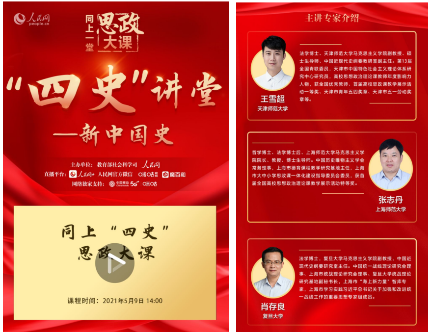 据悉,“同上‘四史’ 思政大课”活动由教育部社科司与人民网联合举办,主要面向全国大学生、思想政治理论课教师进行网络授课。“同上‘四史’思政大课”活动共开设四堂课,授课内容分别为党史、新中国史、改革开放史、社会主义发展史。