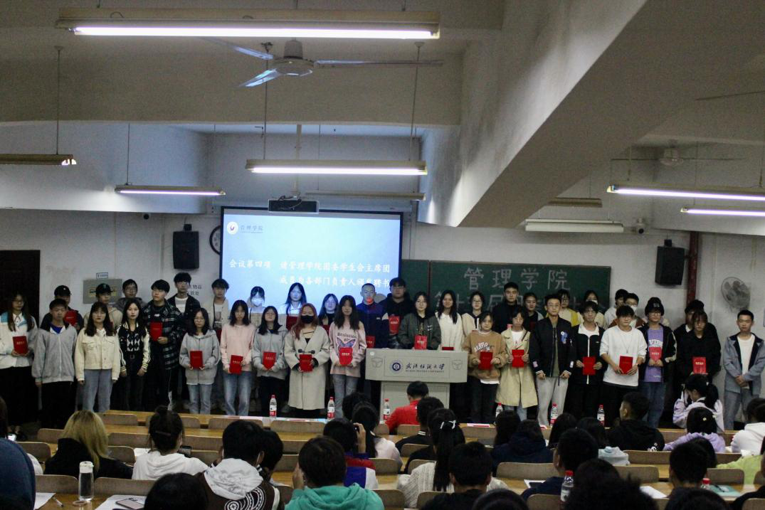 威廉希尔体育团委书记王双喜与主席团成员分别为主席团和各部门负责人颁发学生干部聘书,同时各部门负责人依次上台介绍各部门情况,并对部门新成员提出未来工作展望。