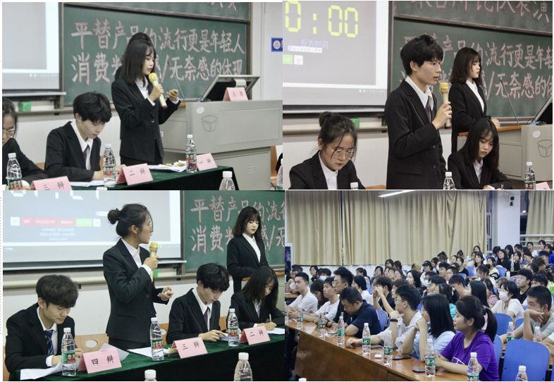此次比赛由吴菲主持,正方一辩闵佩佩、二辩郭凡煜、三辩田有平、四辩贾闰弛与反方一辩李思毅、二辩苏娜娜、三辩王珺楠、四辩刘美红对垒,双方展开了激烈的辩论。在一辩陈词环节中,双方根据自己的观点进行陈述,正方认为平替产品是在经济能力较弱下的主动选择,是实现高性价比与高自我需求的一种体现;而反方认为平替是经济能力下行的退而求其次,因而是其无奈感的体现。