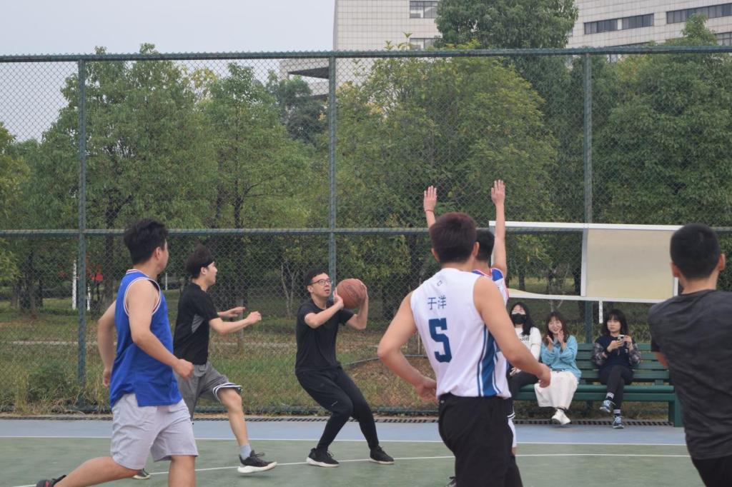 伴随着裁判哨声响起,比赛正式拉开了帷幕。教师代表队快速进入比赛状态,吴金红老师、马小刚老师与张朋龙老师凭借默契的挡拆配合率先上篮得分,与此同时,研究生代表队也不甘示弱,立马以快速反击追回两分。比赛开始就进入白热化状态。双方队伍你来我往,半场结束,老师代表队依据身体与体力优势取得比分领先。
