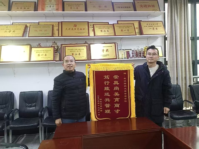 锦旗被悬挂在学院荣誉墙上。吴金红表示:“校友的认可是对学院育人理念最生动的诠释。我们将继续秉持‘崇真尚美、笃行致远’的院训,培养更多经世致用的管理人才。”