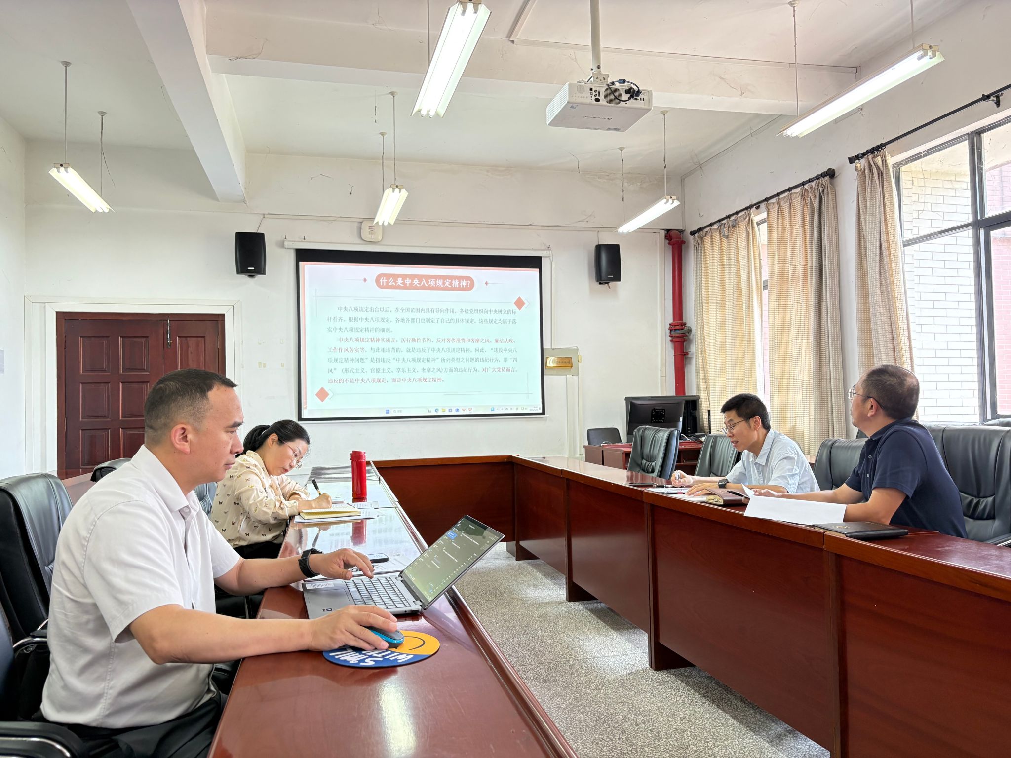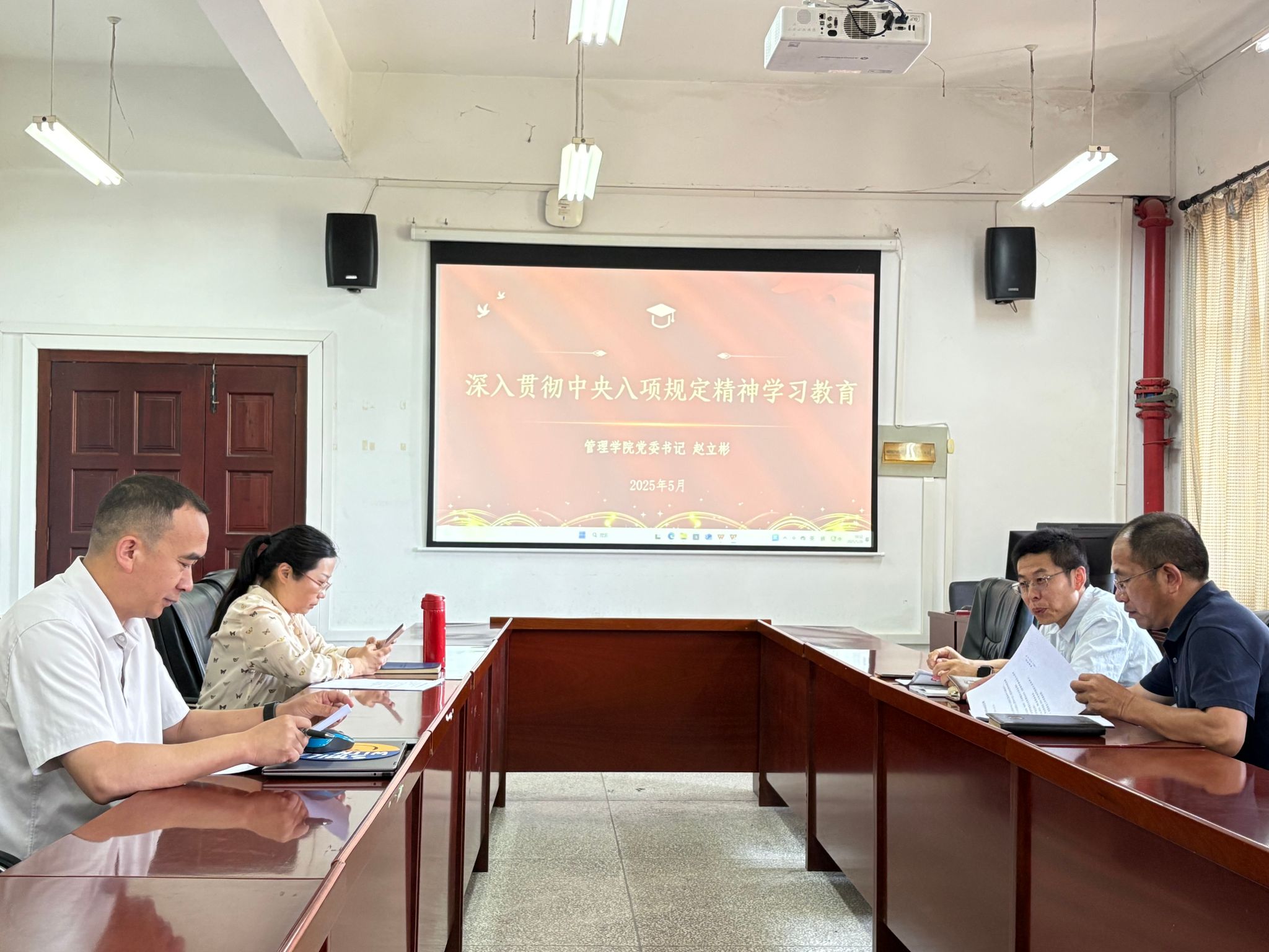 在解读核心内容时,赵立彬结合学院实际和班子成员分管工作,详细阐释中央八项规定精神的具体表现和风险环节。他强调,要摒弃调研中的形式主义,在制定制度、重大事项决定上,必须要深入教师、学生中获取真实情况,为科学决策提供依据;在开展学术、学生活动时,要精简高效,严守标准,把精力放在推动工作发展的关键事务上;在招生、评优评先等环节中,要坚持公平公正,坚决防止腐败和官僚主义。针对学院潜在的廉政风险,他结合高校系统中曾出现的典型廉政风险案例,警示全体委员以案为鉴、防微杜渐。他要求党委委员切实履行全面从严治党主体责任,加强制度建设和监督管理,切实把纪律挺在前面,构建廉洁从教的良好生态。