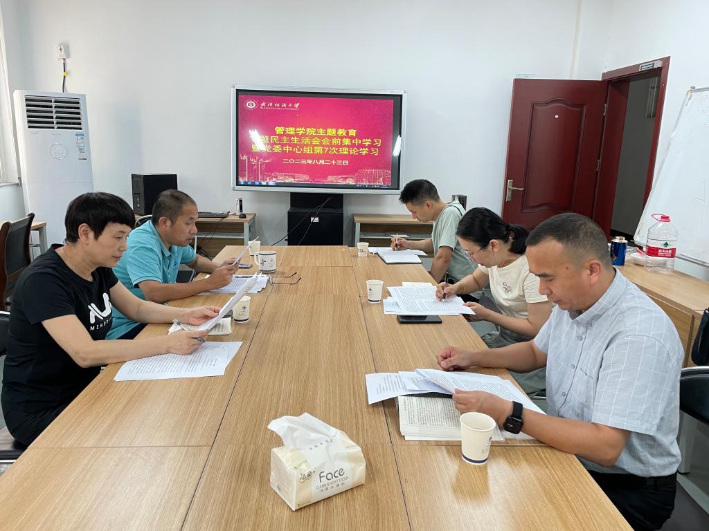 为组织好主题教育专题民主生活会,8月23日下午, 威廉希尔体育在南湖校区西配楼北楼4楼会议室召开主题教育专题民主生活会会前集中学习暨第六次理论学习会。会议由学院党委书记滕胜娟主持,学院全体党委委员参会。