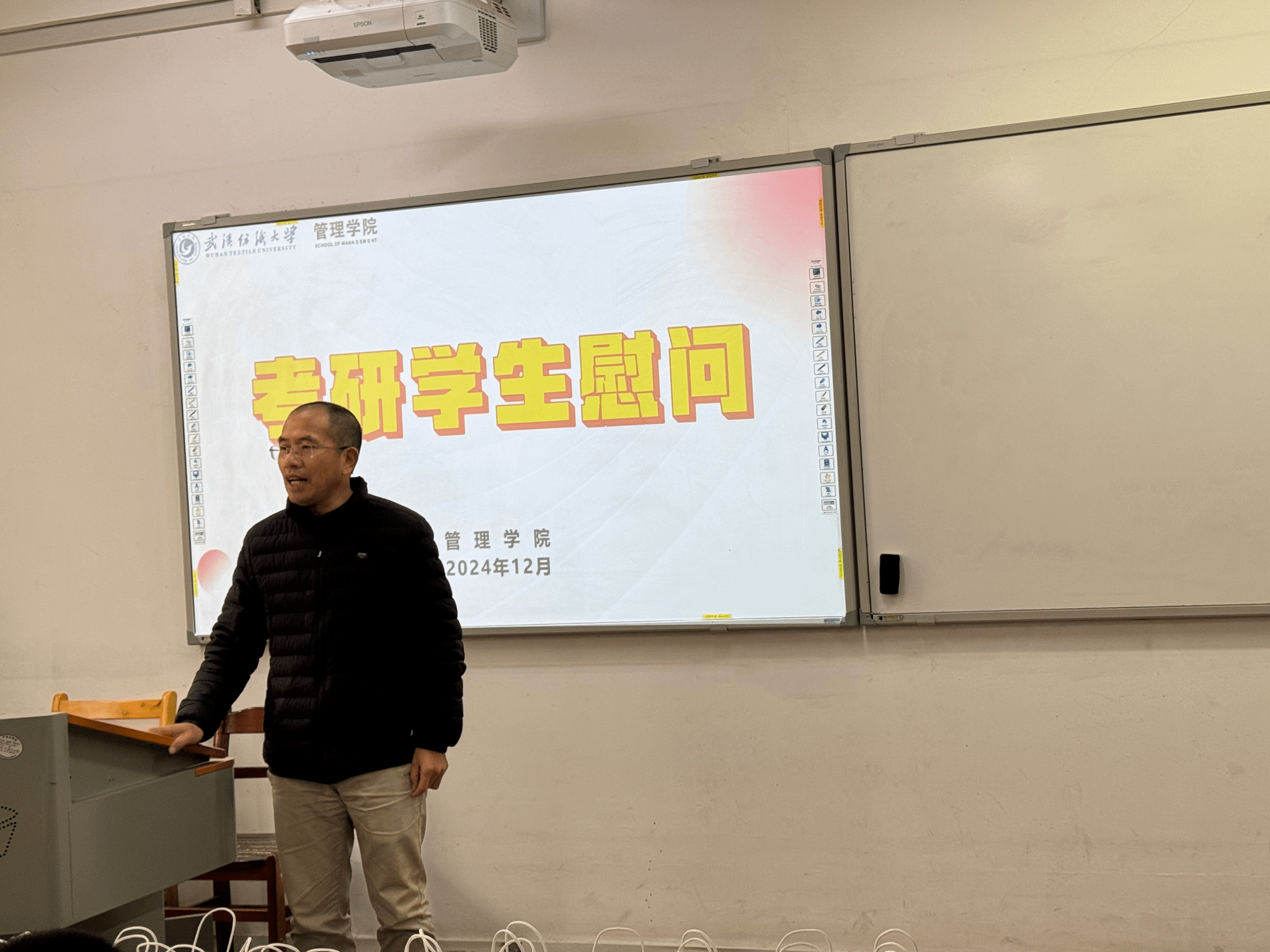 为帮助考研学子们缓解备考压力,鼓舞士气,坚定考研信心,12月5日下午3点半,威廉希尔体育在3栋104教室举办了2024年考研慰问活动,学院党委书记赵立彬、院长吴金红、党委副书记耿迪、2021级辅导员邓兰、牟迪及全体2021级考研学生参加。