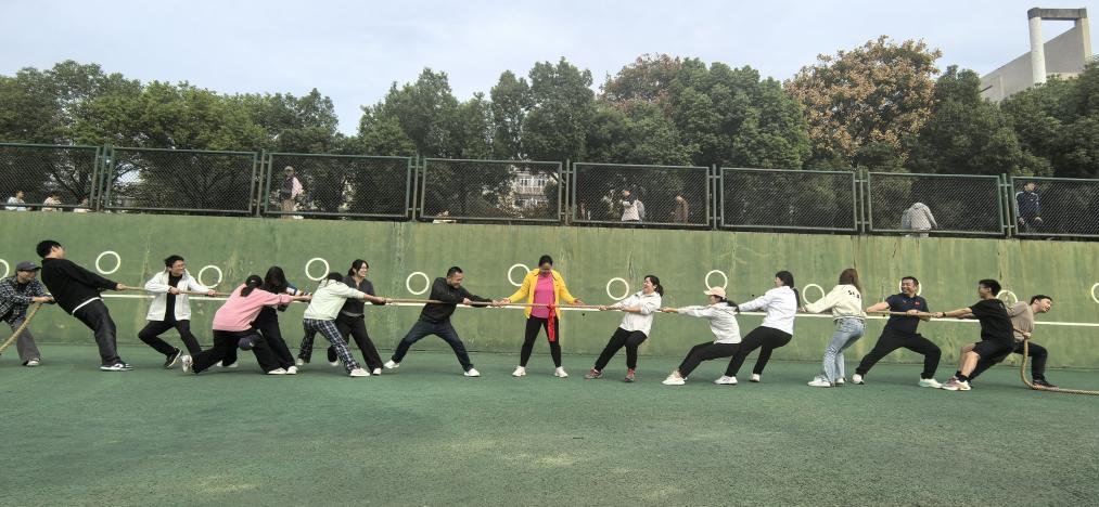 运动会上,项目丰富多样且趣味十足。拔河比赛现场,气氛紧张而热烈,参赛教职工们个个斗志昂扬,紧握绳索,脚蹬地面,身体后倾,齐心协力为团队荣誉而战。