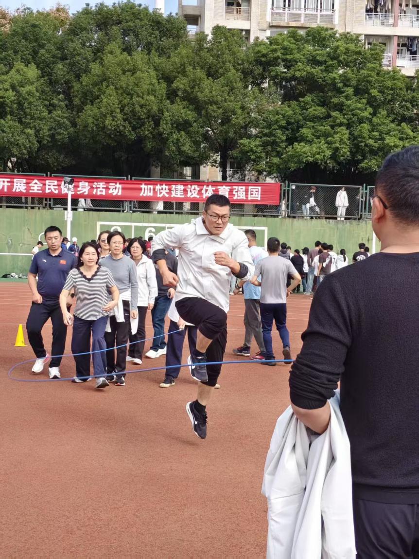集体跳绳时,摇绳的老师专注而有力,跳绳的老师们身轻如燕,随着绳子的摆动有序跳跃,配合十分默契。