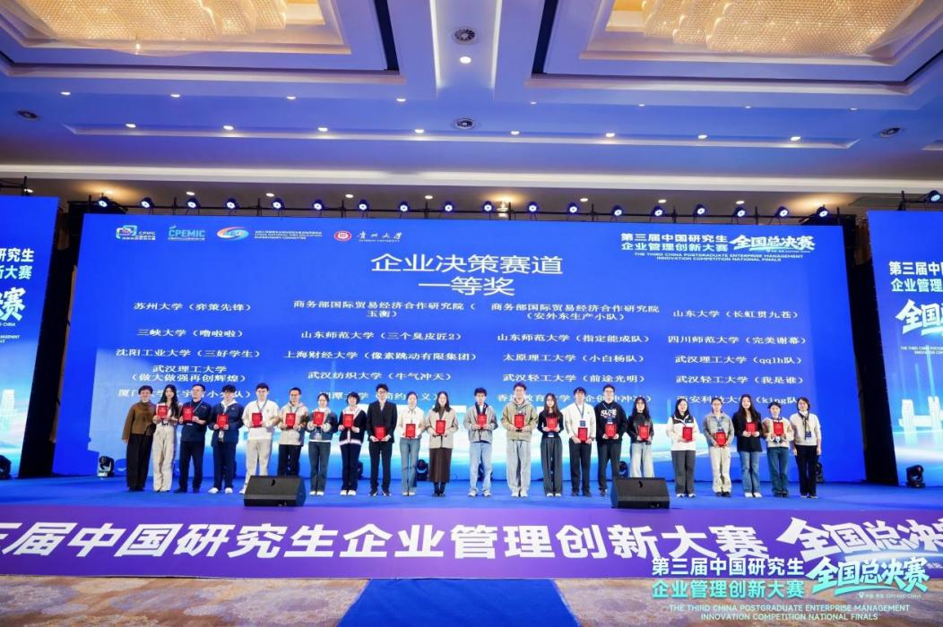 经过激烈角逐,威廉希尔体育余牛指导的“牛气冲天”队(成员:丁俊达、蔡瑾耀、陈嘉灏)荣获企业决策赛道全国一等奖、万欣指导的“开心总动员”队( 成员:刘书洋、程佳欣、张佳瑶)和魏文川指导的“奇迹小组”队(成员:郭红霞、何苹格、柯寅)分别荣获企业决策赛道全国二等奖,这得益于学校和学院的大力支持,充分体现了学院在研究生教育方面的扎实功底与育人成果。