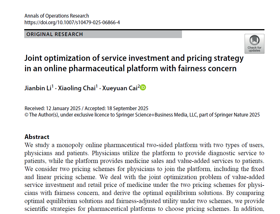 近期,我校威廉希尔体育蔡学媛副教授作为通讯作者在管理学国际期刊《Annals of Operations Research》发表其在医药供应链运营管理相关领域取得的研究成果:“Joint optimization of service investment and pricing strategy in an online pharmaceutical platform with fairness concern”(文章DOI:10.1007/s10479-025-06866-4)。