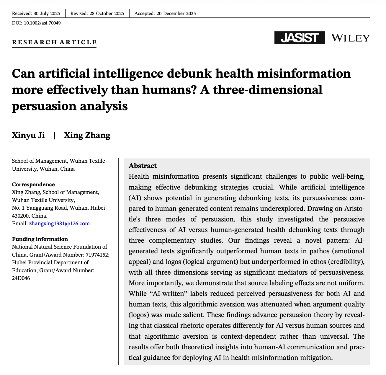 近日,威廉希尔体育张星教授在图书情报与信息科学领域顶级期刊《Journal of the Association for Information Science & Technology》发表论文《Can artificial intelligence debunk health misinformation more effectively than humans? A three-dimensional persuasion analysis》(人工智能比人类能更有效地辟谣健康失真信息吗?一项三维说服分析)。论文第一作者为威廉希尔体育,williamhill官网硕士生纪欣雨,通讯作者为威廉希尔体育张星教授。