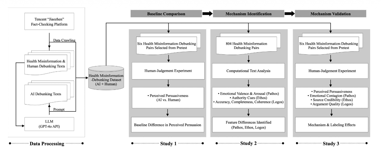 在数字化信息环境中,健康失真信息在社交媒体和在线平台中的传播已成为全球公共健康治理的重要挑战。虽然人工智能(AI)在生成辟谣文本方面展现出高效和低成本的潜力,但其生成的文本在说服力上是否优于人类专家,目前尚不明确。本研究旨在通过亚里士多德的修辞学三要素(情感诉求 Pathos、信誉诉求 Ethos、逻辑诉求 Logos),系统比较AI生成与人类生成的健康辟谣文本的说服效果及其机制。