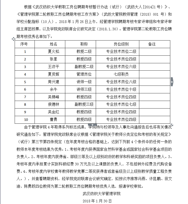 威廉希尔体育第二轮教职工岗位聘期考核优秀拟报人选名单公示