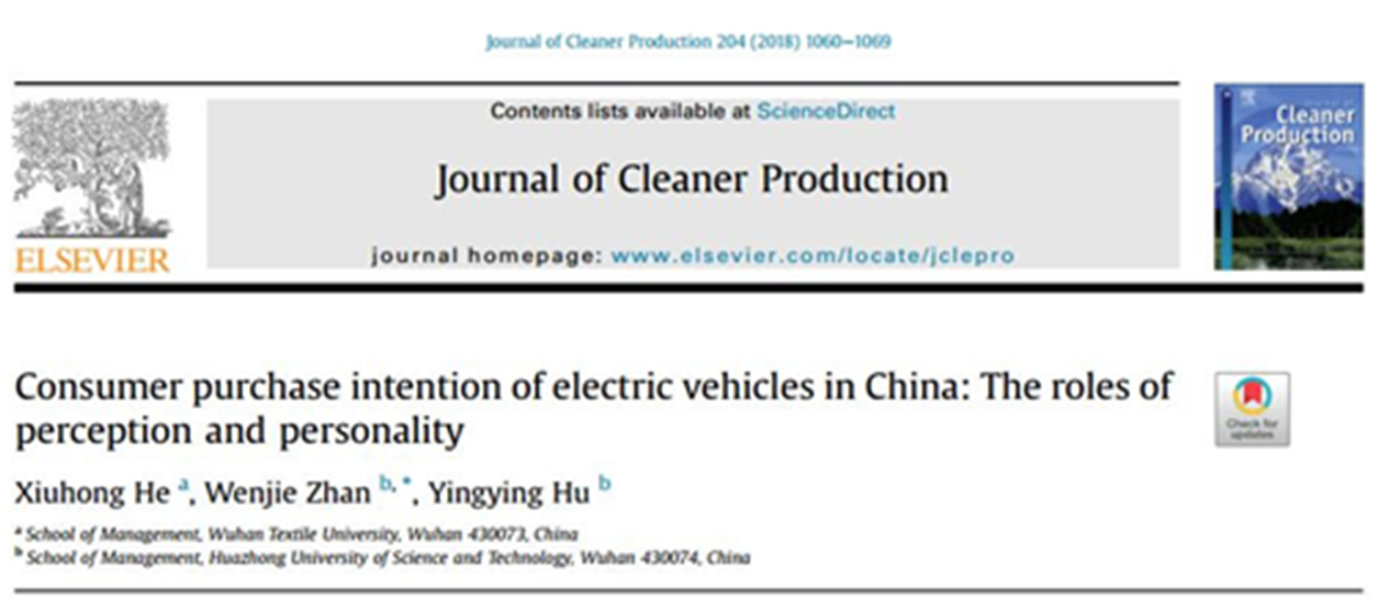 威廉希尔体育新进博士何秀红在中科院SCI期刊分区( 2018年最新版本)1区《Journal of Cleaner Production》(If=5.651)期刊上发表论文 《Consumer purchase intention of electric vehicles in China: The roles of perception and personality》。