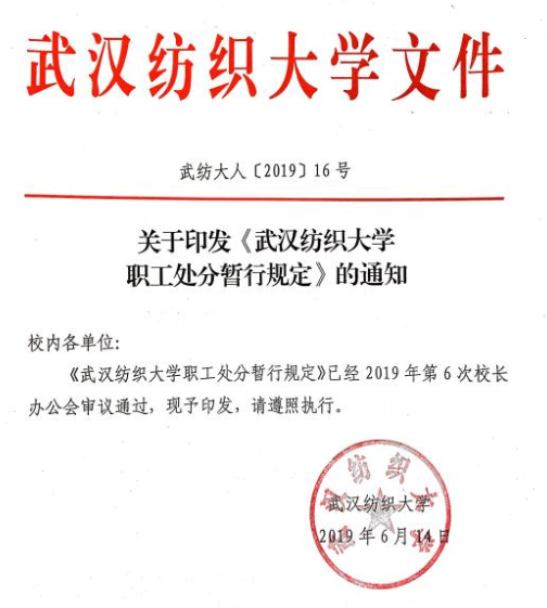 日前,《威廉希尔体育职工处分暂行规定》(武纺大人[2019]16号)经2019年第6次校长办公会审议通过,正式印发。