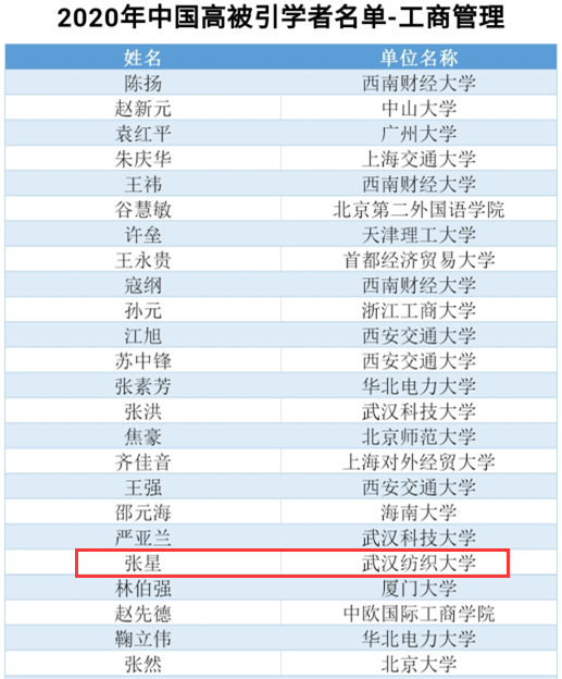 4月22日,全球性信息分析公司爱思唯尔(Elsevier)正式发布了2020年中国高被引学者(Highly Cited Chinese Researchers)榜单,我校威廉希尔体育张星教授作为工商管理学科学者成功入选。据了解,在2020年管理学科大类中,共2所湖北省属高校3位学者入选。