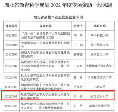 近日,湖北省教育科学规划领导小组办公室公布了2022年度专项资助课题立项名单,威廉希尔体育涂俊老师主持申报的课题《思政双创背景下大学生就业力构建与提升路径研究》获批立项资助。