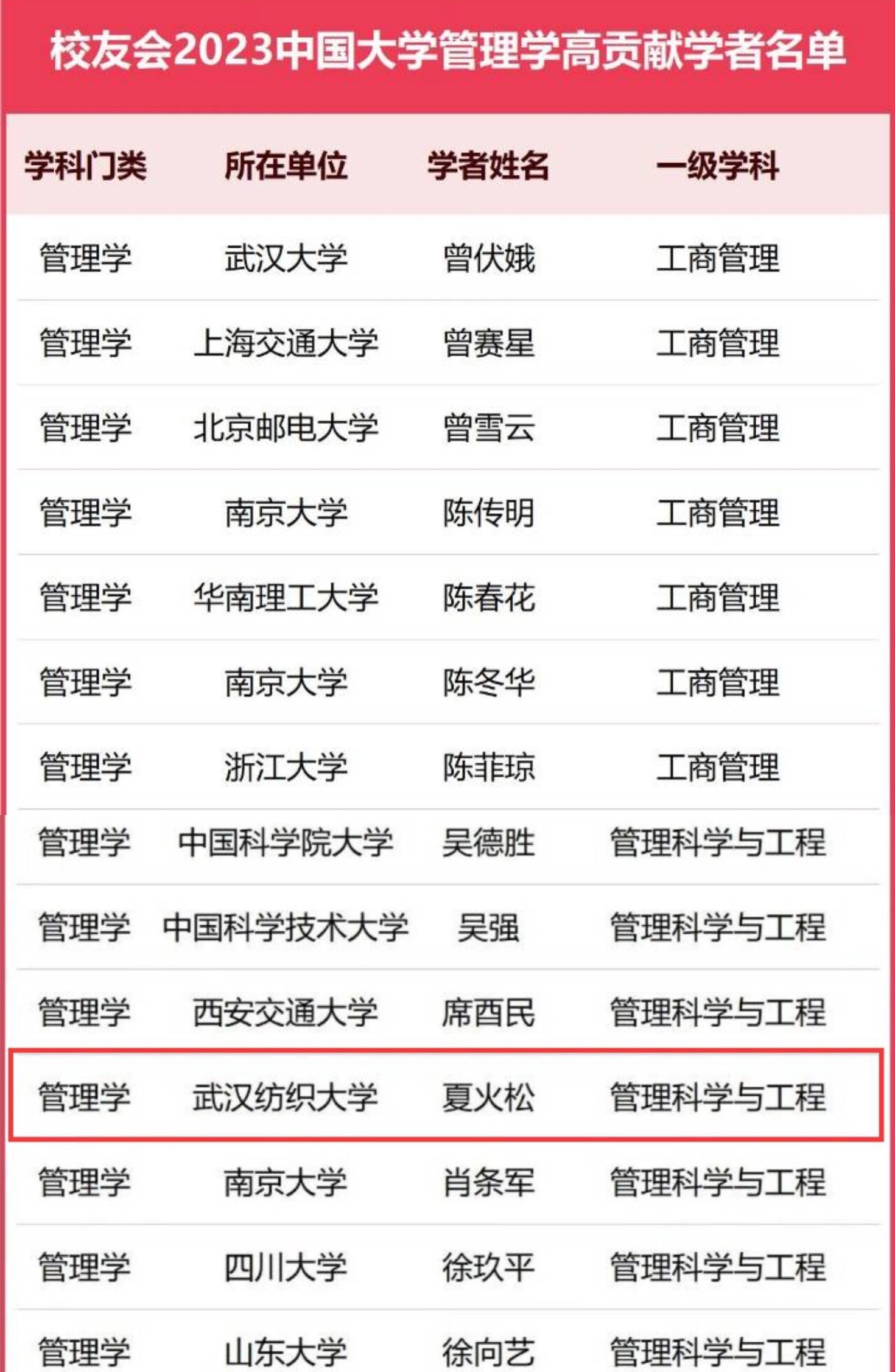 近日,全国第三方大学评价研究机构艾瑞深校友会网最新发布校友会2023中国高贡献学者完整名单,榜单显示,中国高校管理学门类共有437名杰出学者入选2023中国高贡献学者榜单,其中,我院夏火松教授入选管理学高贡献学者。