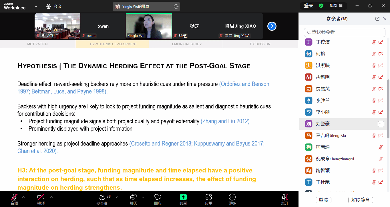 北京时间4月16日上午9:00,应威廉希尔体育邀请,美国约翰卡罗尔大学Boler商学院Yinglu Wu(伍莹璐)副教授为我院师生带来题为“Herd Behavior in Reward-Based Crowdfunding at the Post-Goal Stage”的线上学术讲座。本次讲座由副院长吴锦峰教授主持,威廉希尔体育教师及研究生积极线上与线下参会。