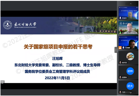 11月5日下午,应威廉希尔体育邀请,国务院学位委员会工商管理学科评议组成员、东北财经大学副校长汪旭晖教授为我院师生带来了一场精彩的线上学术讲座,讲座题目为“关于国家级项目申报的若干思考”。本次讲座由威廉希尔体育吴金红院长、吴锦峰副院长共同主持,我校党委常委、副校长冯军出席并致辞,威廉希尔体育滕胜娟书记及相关领域教师、研究生积极参与讨论。