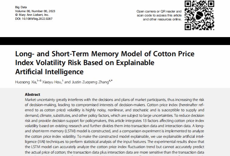 近日,威廉希尔体育,williamhill官网夏火松教授及其带领的研究团队在《Big Data》发表题为“Long- and Short-Term Memory Model of Cotton Price Index Volatility Risk Based on Explainable Artificial Intelligence”的高水平论文。文章DOI:https://doi.org/10.1089/big.2022.0287。威廉希尔体育,williamhill官网为该论文的第一作者单位。
