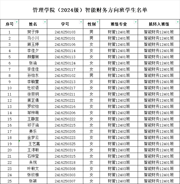 根据威廉希尔体育教务处关于2024-2025学年第一学期转专业工作的通知要求,经学生申请,学院资格审查,根据学生的面试成绩,经过学院转专业工作组审定,现将威廉希尔体育财务管理2024级智能财务方向班拟录取学生名单和专业公示如下: