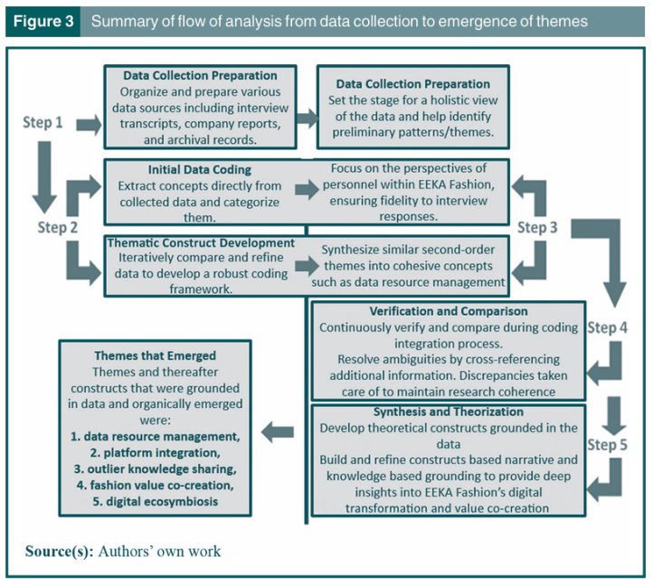 该研究以中国高端女装龙头企业赢家时尚集团(EEKA)为案例,剖析数字化转型中异类知识的挖掘、共享与破坏如何驱动价值共创。研究采用探索性单案例研究方法,数据采集融合一手访谈与二手资料,运用“滚雪球”法逐层访谈并编码。研究基于结构化数据分析框架,通过一阶概念提取、二阶主题凝练及聚合概念生成,结合持续比较法验证理论饱和度。