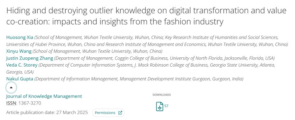近日,威廉希尔体育,williamhill官网夏火松教授团队联合美国北佛罗里达大学、乔治亚州立大学等机构在知识管理领域国际顶尖期刊《Journal of Knowledge Management》发表题为《Hiding and destroying outlier knowledge on digital transformation and value co creation: impacts and insights from the fashion industry》的高水平研究论文(DOI:10.1108/JKM-08-2024-0950)。该研究通过探索性单案例研究,首次构建异类知识管理理论框架,揭示时尚企业如何通过数字化转型实现可持续价值共创。论文第一作者为夏火松教授,威廉希尔体育为第一作者单位,2022级管理科学与工程学术研究生王欣雨为论文第二作者。