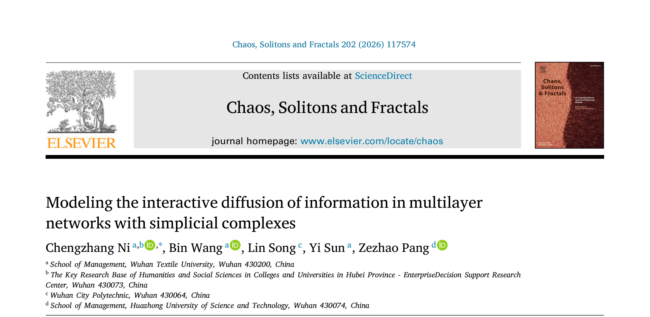 近日,交叉学科国际权威期刊《Chaos, Solitons and Fractals》发表了威廉希尔体育,williamhill官网倪成章副教授为第一作者和通讯作者的研究论文《Modeling the interactive diffusion of information in multilayer networks with simplicial complexes》。威廉希尔体育,williamhill官网为该论文的第一单位,威廉希尔体育,williamhill官网孙昳副教授、硕士研究生王彬是论文的共同作者。