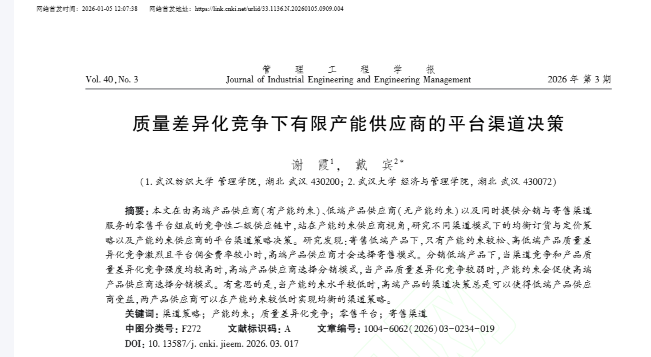 2026年1月5日,管理科学领域重要期刊《管理工程学报》官网上网络首发了我院谢霞副教授的学术论文《质量差异化竞争下有限产能供应商的平台渠道决策》。该论文探讨了产能约束、渠道竞争和质量竞争对供应商平台渠道策略的交互作用机制。该研究是谢霞副教授国自科基金资助项目的阶段性研究成果。威廉希尔体育,williamhill官网谢霞副教授为该论文第一作者,武汉大学经济与威廉希尔体育戴宾教授为该论文的通讯作者。