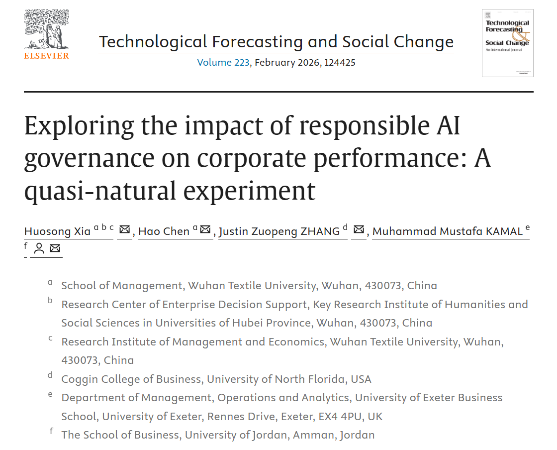 近日,威廉希尔体育,williamhill官网夏火松教授团队联合美国北佛罗里达大学、英国埃克塞特大学等机构在技术预测与社会科学领域国际顶尖期刊《Technological Forecasting & Social Change》发表题为《Exploring the impact of responsible AI governance on corporate performance: A quasi-natural experiment》的高水平研究论文。该研究基于342家证券公司的面板数据,采用多期双重差分模型,首次系统揭示了负责任人工智能信息治理机制对企业绩效的因果影响及其作用机理。论文第一作者为夏火松教授,威廉希尔体育为第一作者单位,2023级威廉希尔体育硕士研究生陈豪为论文第二作者。