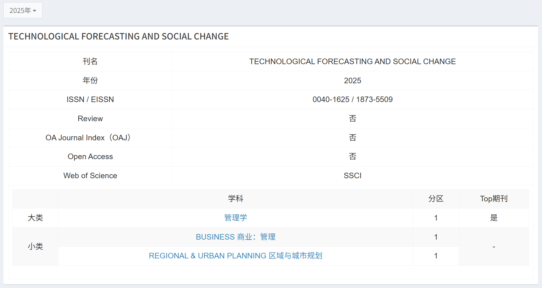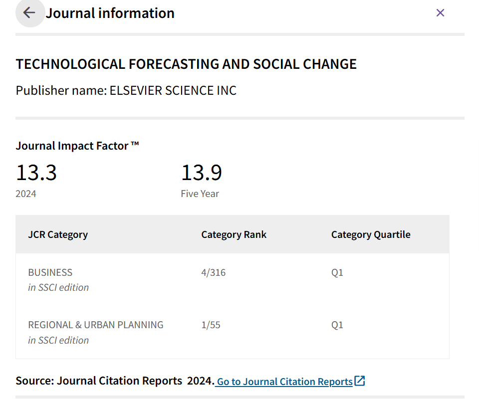 《Technological Forecasting & Social Change》是技术预测、创新管理与社会科学交叉领域的国际权威期刊,为SSCI JCR Q1区期刊,在中科院分区中位列一区。该期刊旨在探讨技术进步与社会环境之间的复杂关系,是全球创新管理与决策科学领域最具影响力的学术期刊之一。