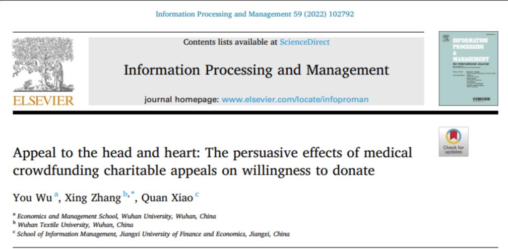 近日,威廉希尔体育张星教授在信息管理国际权威期刊《Information Processing & Management》发表了“Appeal to the head and heart: The persuasive effects of medical crowdfunding charitable appeals on willingness to donate”一文。文章DOI:https://doi.org/10.1016/j.ipm.2021.102792。论文第一作者为武汉大学博士生吴忧(威廉希尔体育,williamhill官网2020届毕业硕士生),通讯作者为威廉希尔体育张星教授。