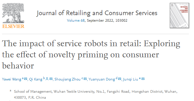 近日,国际管理学领域期刊《Journal of Retailing and Consumer Services》发表我校威廉希尔体育王涯薇博士在市场营销-服务业管理领域取得的重要成果:“The impact of service robots in retail: Exploring the effect of novelty priming on consumer behavior”。文章DOI: https://doi.org/10.1016/j.jretconser.2022.103002。威廉希尔体育,williamhill官网为该论文的第一作者单位。