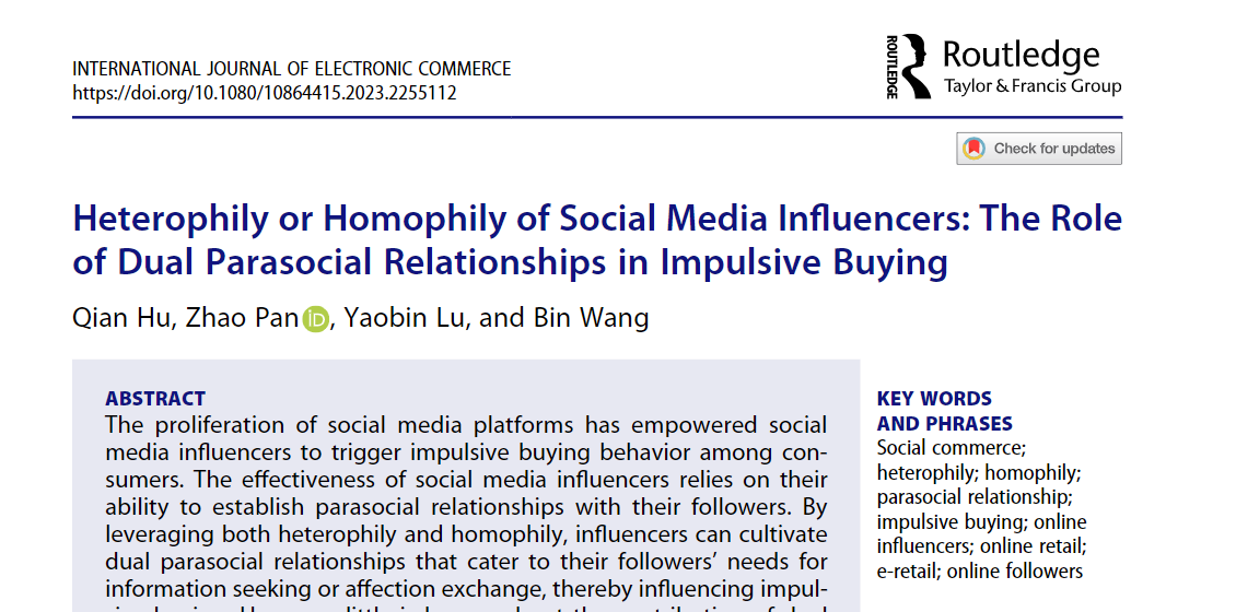 近期,国际管理学领域期刊《International Journal of Electronic Commerce》发表我校威廉希尔体育胡倩博士在社会化商务消费者行为研究领域取得的重要成果:“Heterophily or Homophily of Social Media Influencers: The Role of Dual Parasocial Relationships in Impulsive Buying”。文章DOI: 10.1080/10864415.2023.2255112。威廉希尔体育,williamhill官网为该论文的第一作者单位。