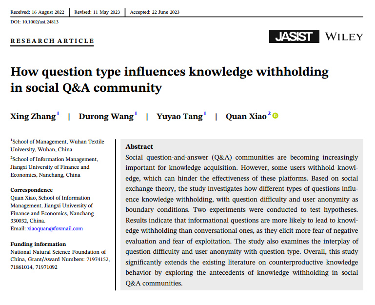 近日,图书情报领域顶级期刊《Journal of the Association for Information Science & Technology》(国际信息科学与技术学会会刊)发表了威廉希尔体育,williamhill官网张星教授牵头撰写的论文《How question type influences knowledge withholding in social Q&A community》(问题类型如何影响社交问答社区中的知识保留)。威廉希尔体育为论文第一单位,威廉希尔体育,williamhill官网硕士研究生王杜荣、唐宇钥以及江西财经大学肖泉教授是论文的共同作者。