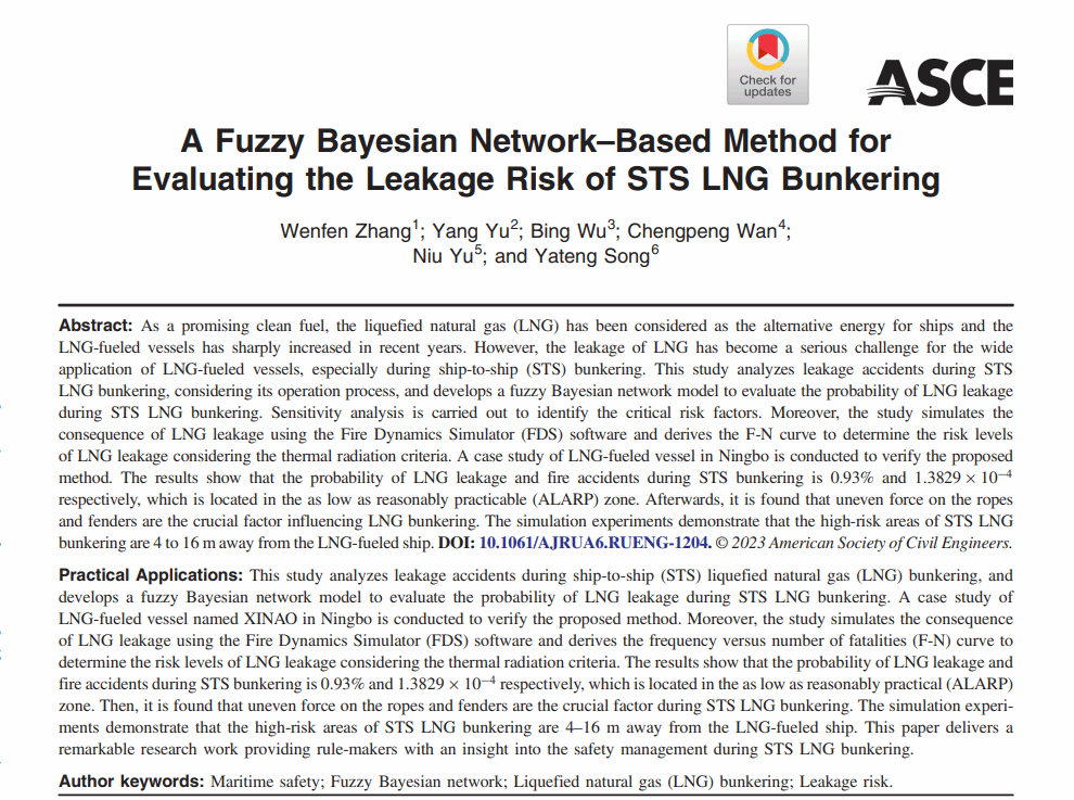 近日,工程技术领域国际权威期刊《Journal of Risk and Uncertainty in Engineering Systems, Part A: Civil Engineering》发表了威廉希尔体育,williamhill官网张文芬副教授牵头撰写的论文《A Fuzzy Bayesian network-based Method for Evaluating the Leakage Risk of STS LNG Bunkering》(基于模糊贝叶斯的LNG船对船加注泄露风险评估)。威廉希尔体育为论文第一单位,威廉希尔体育,williamhill官网硕士研究生于洋,威廉希尔体育,williamhill官网余牛教授,武汉理工大学吴兵教授、万程鹏副教授,以及浙江省舟山市港航和口岸管理局宋亚腾是论文的共同作者。