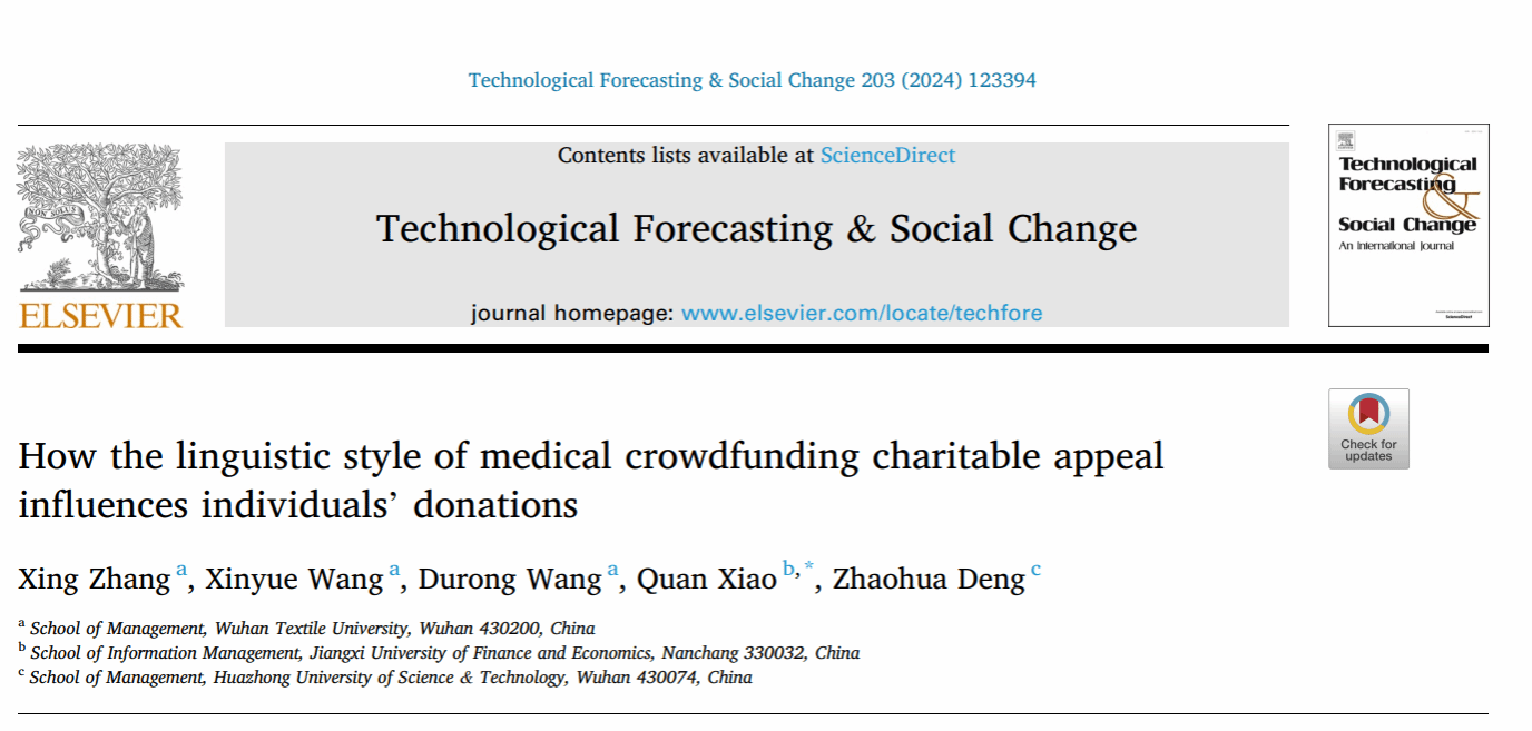 近日,管理学国际权威期刊《Technological Forecasting & Social Change》发表了威廉希尔体育,williamhill官网张星教授作为第一作者撰写的论文《How the linguistic style of medical crowdfunding charitable appeal influences individuals’ donations》(医疗众筹慈善呼吁的语言风格如何影响个人的捐赠)。威廉希尔体育为论文第一单位,威廉希尔体育,williamhill官网硕士研究生王心玥和王杜荣、江西财经大学肖泉教授和华中科技大学邓朝华教授是论文的共同作者。