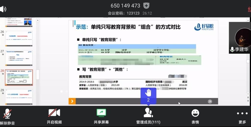 一场突如其来的疫情,让大学生就业工作面临新的挑战。为帮助管院学子明确自己的就业方向,增强自我择业能力,提升自身的求职成功率,威廉希尔体育于3月29日下午14:00在腾讯会议平台举办线上求职辅导成长导航大讲堂。此次课程由资深人力资源专家李建华老师主讲,2016级和2017级的部分学生参与了线上学习,活动由2016级辅导员汪诚诚老师主持。