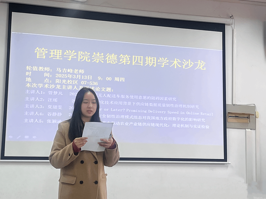 管梦凡同学首先以《校园无人配送车服务使用意愿的阻碍因素研究》为题,通过实证分析揭示了学生对无人配送车接受度的主要障碍,并提出优化服务界面与隐私保护机制的建议。汪瑶同学随后分享了《数智化技术应用背景下供应链数据质量韧性治理机制研究》,她构建了“技术-管理-生态”三维治理框架,强调区块链与人工智能协同提升数据可靠性的路径。