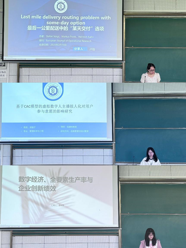 卢璇同学分享的论文《Last mile delivery routing problem with some-day option》,提出了“某天”交付选项以优化最后一公里配送的成本和环境效益。胡璇子同学基于CAC模型,研究了虚拟数字人主播拟人化对用户参与意愿的影响。最后,夏琎雯同学则以《数字经济、全要素生产率与企业创新绩效》为题,探讨了数字经济对企业创新绩效的促进作用。
