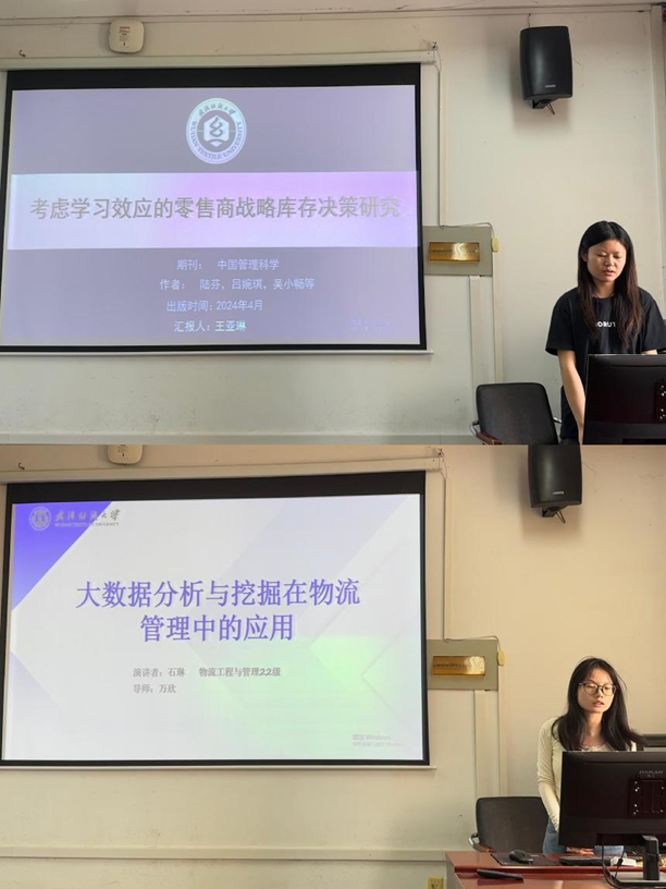 王亚琳同学探讨了《考虑学习效应的零售商战略库存决策研究》,分析了学习效应与战略库存对供应链利润的影响。最后,石琳同学分享了《大数据分析与挖掘在物流管理中的应用》,梳理了物流管理大数据的研究热点。