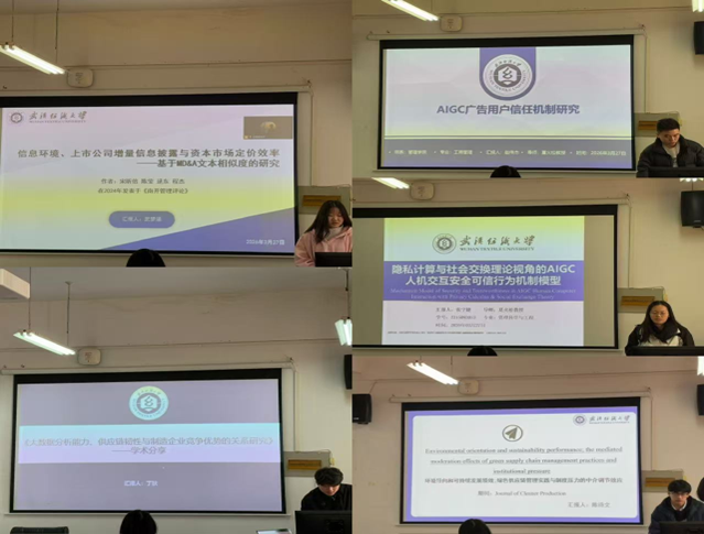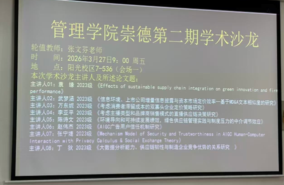 分会场7-536教室,袁缘同学线上分享的《Effects of sustainable supply chain integration on green innovation and firm performance》研究可持续供应链整合与绿色创新、企业绩效的关系,得出差异化影响结论。武梦涵同学通过《信息环境、上市公司增量信息披露与资本市场定价效率——基于MD&A文本相似度的研究》以上市公司MD&A文本相似度为切入点,探究增量信息披露与资本市场定价效率的关系,为提升上市公司信息披露水平提供新的经验证据;万东妮同学在线上以《考虑消费者滞留成本的双寡头企业定价策略研究》引入消费者滞留成本,构建双寡头动态博弈模型,揭示了不同定价策略对企业盈利与社会福利的影响机制。李亚平同学在线上分享的《考虑主播类型和品牌商销售模式的直播供应链决策研究》结合主播类型与销售模式,研究直播供应链决策及流量效应的影响。陈诗文同学分享的《环境导向和可持续发展绩效,绿色供应链管理实践与制度压力的中介调节效应》围绕环境导向与企业绩效展开研究,为企业绿色发展与供应链管理提供了跨地域的实证证据与理论参考。赵伟杰同学分享的《AIGC广告用户信任机制研究》和张宁婕同学分享的《Mechanism Model of Security and Trustworthiness in AIGC Human-Computer Interaction with Privacy Calculus & Social Exchange Theory》分别聚焦AIGC广告用户信任机制、AIGC人机交互安全可信机制展开研究,通过实验设计与模型构建,深化了对AIGC时代人机交互与用户信任的理论理解,为相关平台优化设计提供实践参考;丁狄同学以《大数据分析能力、供应链韧性与制造企业竞争优势的关系研究》融合资源基础观与动态能力理论,证实大数据分析能力可通过提升供应链韧性,助力制造企业构建竞争优势,并结合比亚迪案例完成实证分析,实现了理论研究与企业实践的有机结合。