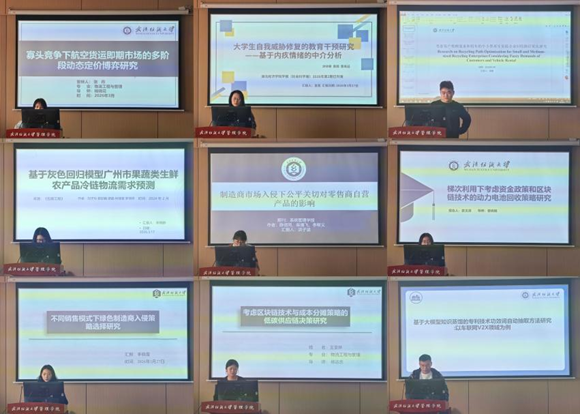 分会场7-513教室,张丹同学的《寡头竞争下航空货运即期市场的多阶段动态定价博弈研究》以寡头竞争下航空货运即期市场为研究对象,为航空货运公司精细化收益管理提供理论支撑;童茜同学在《大学生自我威胁修复的教育干预研究——基于内疚情绪的中介分析》聚焦大学生自我威胁修复问题,通过实证研究明确了适应性行为的重要价值,为高校心理健康教育提供实践建议;徐碧同学分享的《考虑客户模糊需求和租车的中小型再生资源企业回收路径优化研究》针对中小型再生资源企业回收成本高的行业痛点,设计改进遗传算法求解最优路径规划方案;宋琬婷同学通过《基于灰色回归模型广州市果蔬类生鲜农产品冷链物流需求预测》通过多模型对比,为相关部门科学化决策提供方法参考。洪子涵同学分享的《制造商市场入侵下公平关切对零售商自营产品的影响》和袁玉清同学的《梯次利用下考虑资金政策和区块链技术的动力电池回收策略研究》分别围绕制造商市场入侵、动力电池回收等问题,运用 Stackelberg 博弈理论构建模型,深入分析不同市场情境下企业的定价、策略选择与供应链最优决策;李晓雪同学以《不同销售模式下绿色制造商入侵策略选择研究》聚焦消费者绿色需求与电商平台多元销售模式背景,运用博弈理论求解并对比不同模式下各决策主体的利润表现,研究其市场入侵策略选择。王亚琳同学通过《考虑区块链溯源技术与成本分摊策略的低碳供应链决策研究》则将区块链溯源技术与低碳供应链相结合,为低碳供应链的落地实施提供了新的思路。段均昊同学分享的《基于大模型知识蒸馏的专利技术功效词自动抽取方法研究:以车联网V2X领域为例》结合大模型知识蒸馏技术,研究车联网V2X领域专利技术功效词自动抽取方法,为专利信息处理提供了新的技术路径。