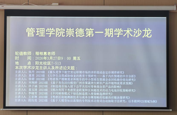 本次2026年第1期“崇德”学术沙龙的成功举办,集中展示了威廉希尔体育研究生在学术研究中的阶段性成果,各位主讲人的研究既紧扣数字化转型、绿色可持续发展、供应链韧性提升等时代前沿议题,体现了“研以致用”的学术导向。沙龙不仅为研究生提供了展示研究成果、交流学术思想的平台,更促进了不同研究方向间的交叉融合,激发了全院学子的科研热情与创新思维。