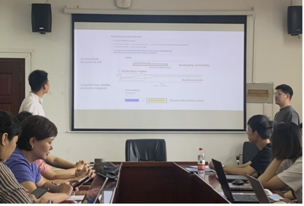 会议开始,余牛教授对黄日环博士表示了热烈欢迎,并介绍了他的主要研究方向和学术成果。接着,黄日环博士从行为经济学的角度探讨了供应链中的贸易信用和破产风险,结合多学科的研究范式,从背景、研究方法、研究假设和结论几个方面展开研究具体内容。该研究通过数学建模的方式,构建制造商和零售商在有限责任下定价和订货量的模型;其次,根据理论结果进行行为实验,发现与模型预期结论存在误差;最后,根据行为经济学中的相关理论,力求解释行为实验结果与理论值的偏差。